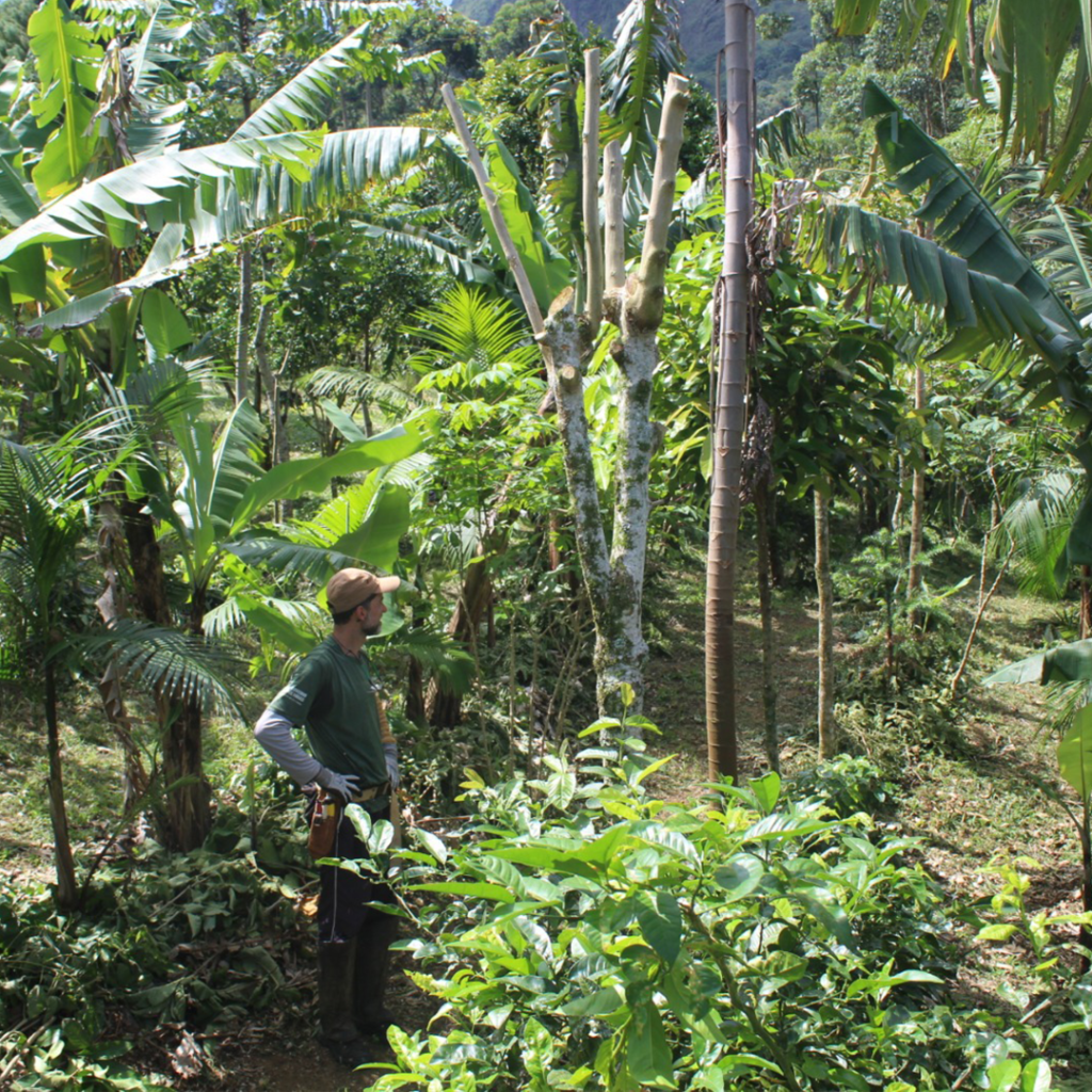 Neste método, trabalhamos com agricultores locais para restaurar áreas degradadas com o plantio de mudas de espécies nativas associadas com espécies comerciais já estabelecidas na região (abacate, banana e café). Também estamos enriquecendo os sistemas agroflorestais com espécies frutíferas, nativas da Mata Atlântica, com potencial econômico. Além de contribuir para ampliar a cobertura florestal nas propriedades e diversificar a produção de alimento, nosso trabalho de restauração com agrofloresta tem possibilitado geração de renda, melhorando a relação entre o ser humano e a natureza.